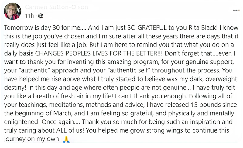 Hi, I’m Rita Black – a Clinical Hypnotherapist and Specialist in Hypnosis for Weight Loss