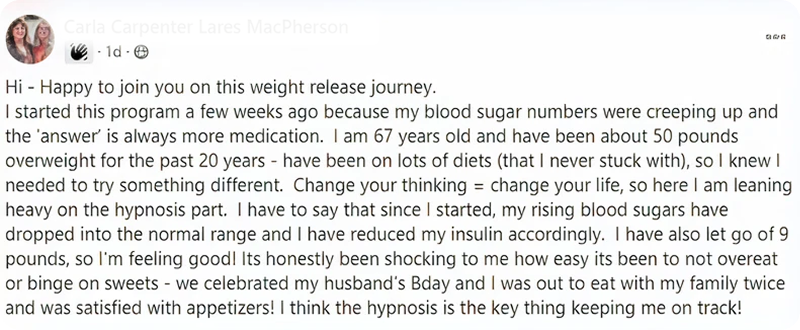 - Experience a powerful weight release hypnosis session that will align all of your mind towards weight loss success (even if you don’t think you can be hypnotized).